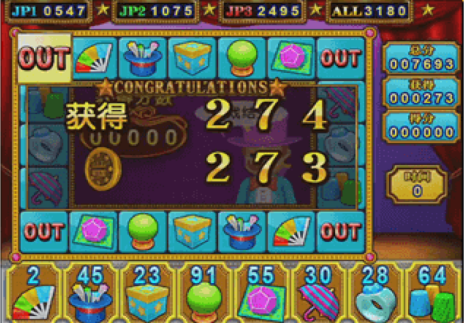 游戏中需投币启动转盘进行抽奖,转到OUT游戏结束,抽中的图案积分之和,为本局转盘游戏奖励代币